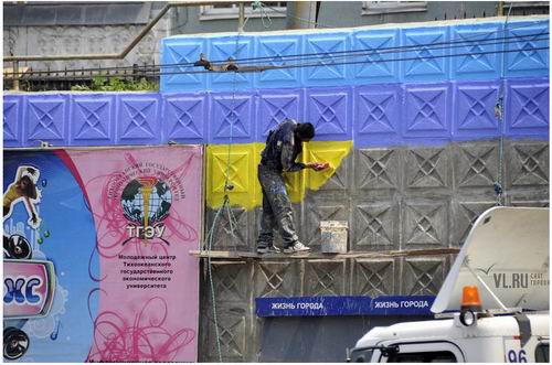 Подпорные стены в Первореченском районе приводят в порядок![]() Завершается окраска трех подпорных стен в Первореченском районе. Две из них полностью готовы, работы над третьей, расположенной на ост. Молодежная, закончатся на днях. Какие именно изменения произошли с подпорными стенками, корреспонденту 1речки рассказал Александр Бойко – исполнительный директор мастерской монументального искусства «33 плюс 1». - Владивосток можно образно назвать «центром Востока», «форпостом», поэтому он должен быть краше других, - считает Александр Бойко. - Тем более для этого есть все условия - интересный рельеф обуславливает наличие подпорных стен, ставших уже своеобразным символом Владивостока. После советского периода, когда выкладывались мозаики и создались рельефы, это направление практически не развивалось. Сейчас администрация города совместно с главным архитектором Владивостока Анатолием Мельником, главным художником города Павлом Шугуровым, главами районов содействует тому, чтобы город преобразился. Чтобы в нем не было беспорядочно разбросанных цветных пятен и серости, а был единый цветовой план. Цветовая экология- Существует такое понятие, как цветовая экология, - продолжает Александр. - Когда человек смотрит на город и видит обилие цветных пятен, не согласованных между собой, - у него возникает чувство дисгармонии. Это означает, что цветовая экология нарушена. Поэтому внешний вид города должен приводиться в порядок. - Какие стены в Первореченском районе обновили в этом году? - В этом году мы восстанавливали стену возле ТОВМИ (конец Некрасовского путепровода) после зимнего и весеннего периодов. На стенке изображен абстрактный рисунок – человек, несущий чемодан. Поскольку стена находится рядом с проезжей частью, краска на ней поблекла. Наша Мастерская тщательно вымыла стену и обновила краску. Второй объект – это стена, территориально находящаяся на границе Первореченского и Ленинского района, на путепроводе Гоголя-Некрасовская. В народе ее называют «радугой». Проект создан по эскизу Павла Шугурова на тему этюда Владивостокского художника-авангардиста Кирилла Шебеко. Этюд был творчески переведен в цветную абстракцию, на основе которой было выкрашено около 1200 кв. м стены. На самом деле это прорыв в концептуальном искусстве, такого в России еще не делалось - подобные творения существуют только за рубежом. В этом году мы обновили на стене только один выцветший цвет. Гостевому маршруту – особое внимание- Еще один объект – это подпорная стена на ост. Молодежная, площадью 1,5 тыс. квадратных метров. Внешнему виду этой стены уделяется повышенное внимание, так как она проходит по гостевому маршруту. Работы на ней сейчас заканчиваются. Уже обновлены 33 рельефа, изображающие символы Владивостока: эндемические растения, праворульный автомобиль, корабли, подводную лодку, собор, тигра и др. Раньше на этой стене был рисунок, состоящий из цветных кругов вокруг рельефа, но это был временный проект, и в этом году принято решение придать стене более натуральный цвет. Сейчас стена окрашивается по другому эскизу: убираются круги, чтобы вынести на первый план рельефы. Рисунок состоит из одного тона, в котором несколько цветов: желтый, терракотовый и два оттенка сложного серого. На рисунке подсвечены некоторые рельефы, изображающие луч. С одной то