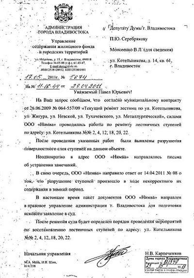 Разрушенная лестница по ул. Котельникова, 2, 4, 6, 8 будет восстановлена, похоже, только по решению суда Управление содержания жилищного фонда и городских территорий администрации Владивостока подготовило ответ на запрос депутата Думы Владивостока Павла Серебрякова относительно ремонта преждевременно разрушившихся лестничных маршей вдоль домов по улице Котельникова,2, 4, 6, 8. Как говорится в документе, решение данной проблемы возможно только по решению суда.