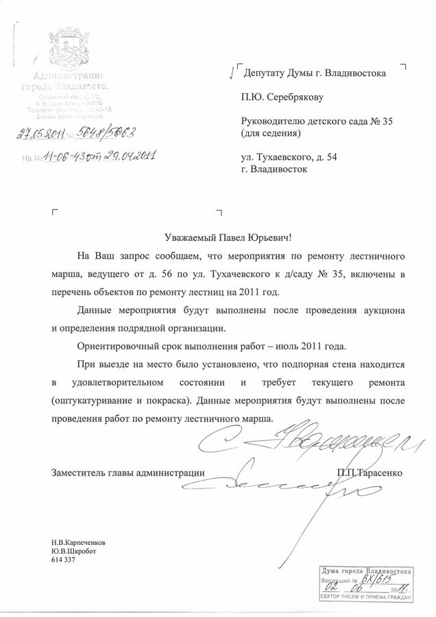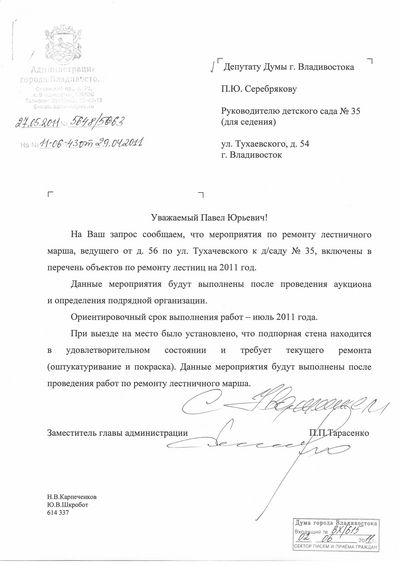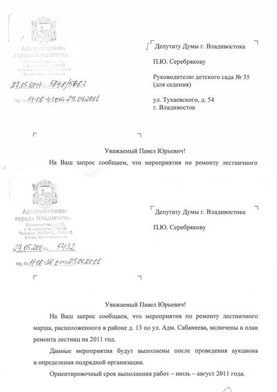 Еще две лестницы района должны отремонтировать в этом году Лестничные маршы по адресам ул. Сабанеева,13 и ул. Тухачевскго,56 включены в план ремонта лестниц на 2011 год. Информация об этом содержится в ответе на запрос депутата Думы Владивостока Павла Серебрякова в городскую администрацию.
