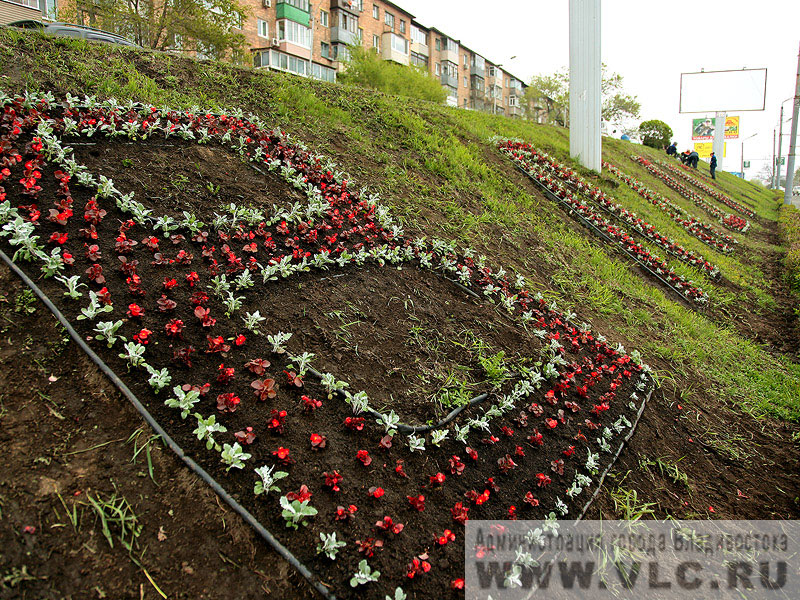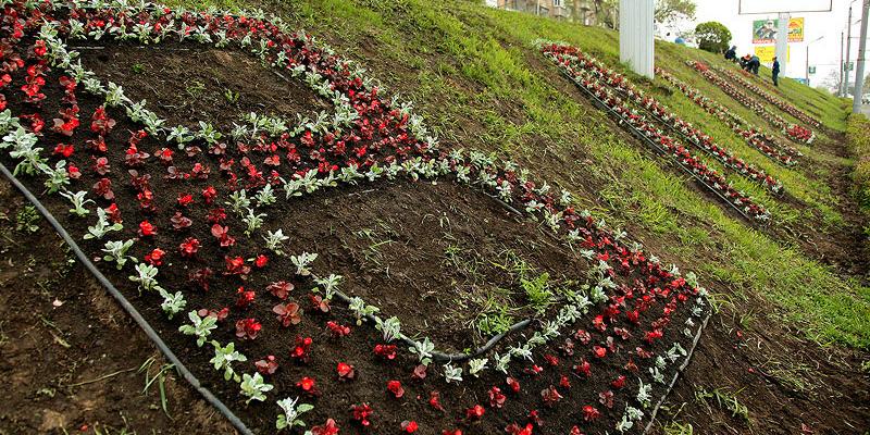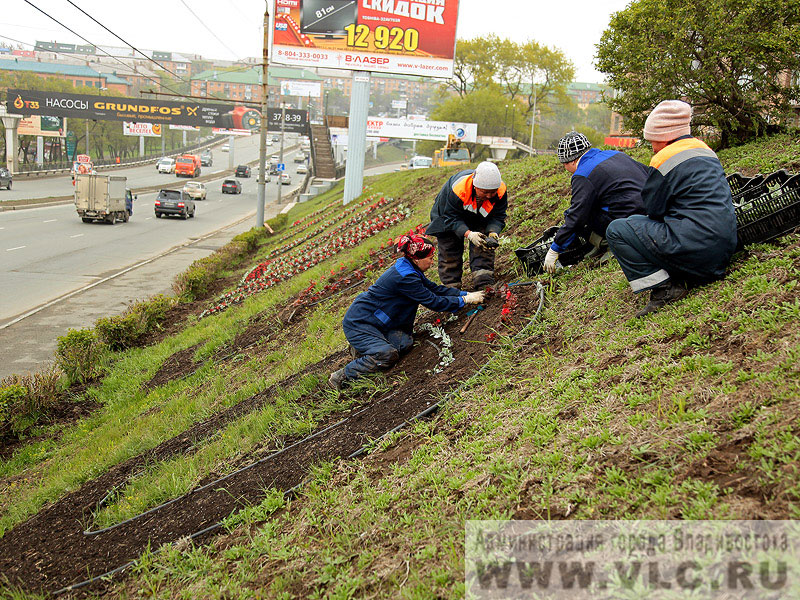 На склоне появится целая цветочная композиция: помимо слова "Владивосток" озеленители высадят еще белую чайку и российский флаг. Всего там появится 4,5 тысячи цветов. По словам специалистов, радовать глаз горожан они будут примерно до октября.