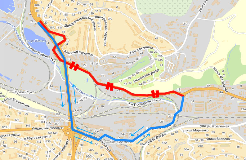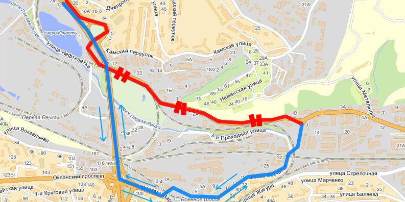 Соответственно, движение автобусов по маршрутам №4-д "Окатовая - Автовокзал", №82 "Окатовая - Варяг", №11 "Луговая - Варяг", №2 "Луговая - Заря", №64-э "Бухта Тихая - Заря" будет осуществляться в обоих направлениях в объезд через Военное шоссе, Народный проспект, Некрасовский путепровод.