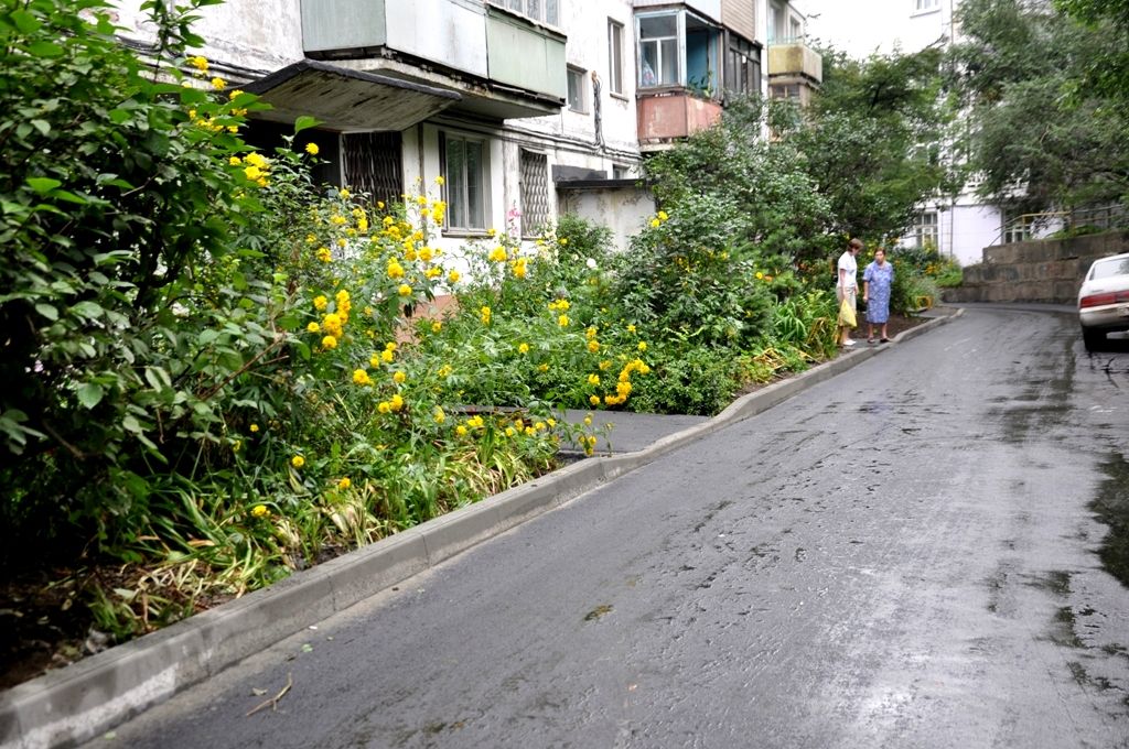 Продолжается ремонт придомовых дорог Первореченского района Работы по ремонту дорог ведутся во всех районах города. На этой неделе в Первореченском районе ведется устройство асфальтобетонного покрытия на улицах Амурской и Стрелочной. На улице Котельникова 15 идет установка нового бордюра и ремонт тротуаров.