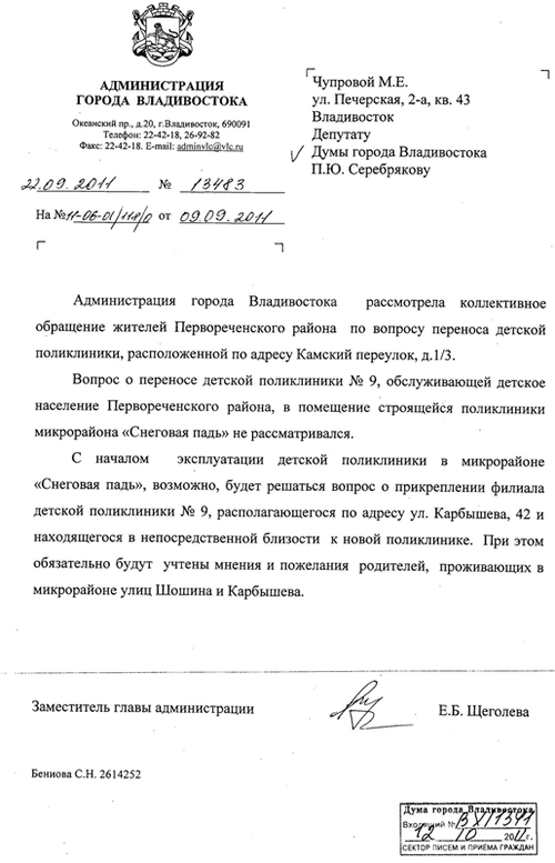 В приемную депутата Думы Владивостока Павла Серебрякова обратились жители с опасениями, что филиал детской поликлиники №9, располагающейся по адресу Камский переулок,1/3, могут перенести в микрорайон Снеговая Падь. Депутат отправил запрос в администрацию, на который получил ответ, что с началом эксплуатации детской поликлиники в микрорайоне Снеговая Падь, возможно, будет решаться вопрос о прикреплении филиала детской поликлиники №9, располагающейся по адресу ул. Карбышева,42 и находящегося в непосредственной близости к новой в Снеговой Пади. При этом обязательно будут учтены мнения и пожелания родителей, проживающих в микрорайоне улиц Шошина и Карбышева. Вопрос о переносе других филиалов поликлиники не рассматривался.