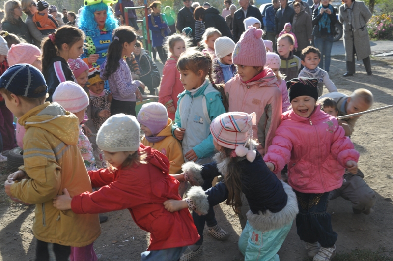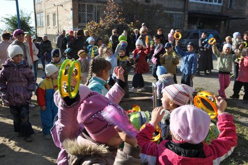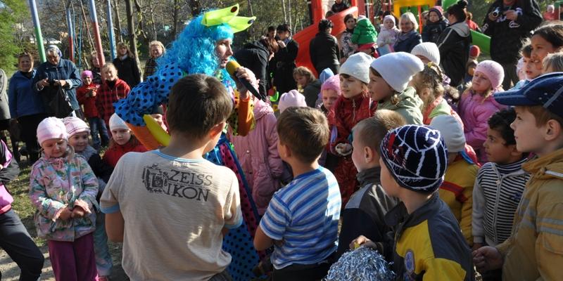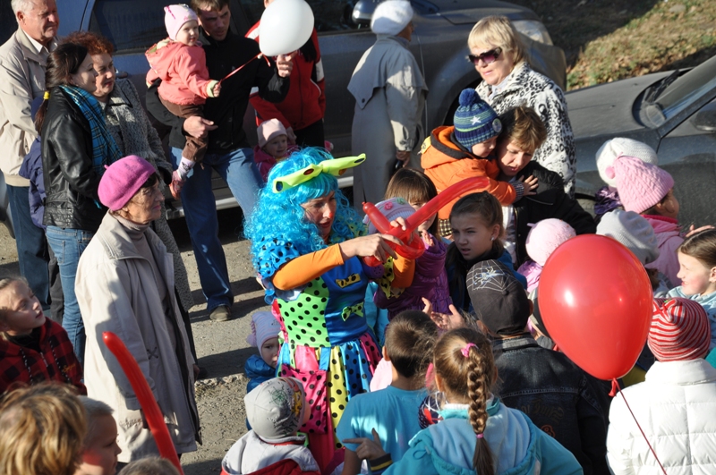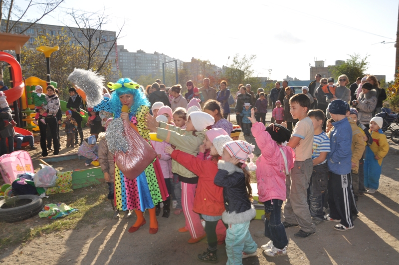На праздник собрались ребятишки со всех ближайших домов. Вместе с веселым клоуном дети играли в различные игры, танцевали, отгадывали загадки и даже создавали забавную какофонию с помощью бубнов.