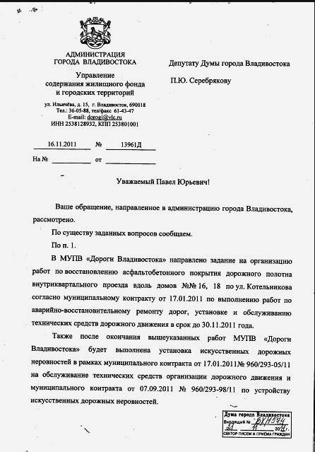 Ремонт дороги и бордюр на ул. Карбышева вдоль домов № 20, 24, 26, 28, 30 закончится до конца ноября. Об этом говорится в ответе администрации города Владивостока на запрос депутата Думы Владивостока Павла Серебрякова.