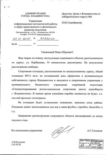 В ответе на запрос депутата сказано, что спортивная площадка, расположенная по адресу ул. Карбышева,54, общей площадь. 807,4 кв. м. на сегодняшний день оформлена в муниципальную собственность города. Она находится в оперативном управлении у муниципального бюджетного учреждения спортивной подготовки «Специализированная детско-юношеская спортивная школа единоборств Владивостока». В зимнее время коробка заливаться не будет, т. к. под ней проходит теплотрасса.