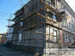 Стены уцелевшей части дома специалисты укрепили с помощью металлических пластин и химических анкеров. Пояс из металлических пластин, в которые на специальный химический состав "сажают" анкера, опоясывает дом по всему периметру. Также строители оштукатурили стены, сделали фактурную отделку, оформили цоколь и покрасили здание в четыре цвета. Территория вокруг дома заасфальтирована, уложены лестничные марши.