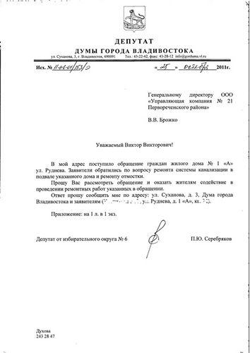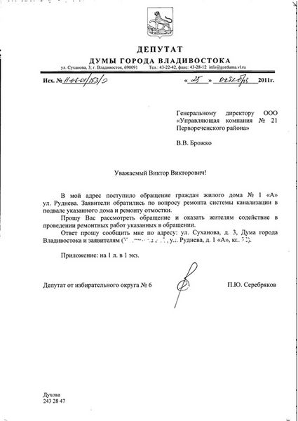 В ответа обращение депутата Первореченская управляющая компания сообщила, что все ремонтные работы по устранению аварийной ситуации были выполнены 8 ноября 2011 года. В подвале помещения второго подъезда дома почищены стояки канализации, течей коммуникации холодной воды и водоотведения не выявлено. Подвальное помещение сухое, освещено, вход в подвал закрыт на замок.