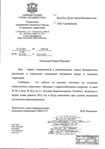 Согласно ответу на запрос, работы по ремонту лестницы на остановке общественного транспорта «Баляева» и асфальтобетонного покрытия от ул. Луговой,60 к ул. Луговой,62а включены в проект плана ремонта на 2012 год. Они будут выполнены при условии выделения достаточного финансирования.