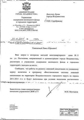 В адрес депутата Павла Серебрякова поступило коллективное обращение жителей дома ул. Постышева,11, по которому им был направлен запрос в администрацию города.