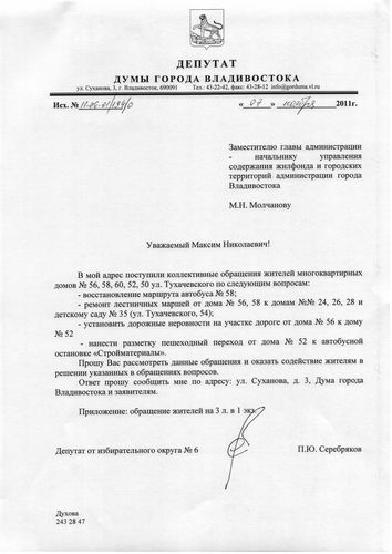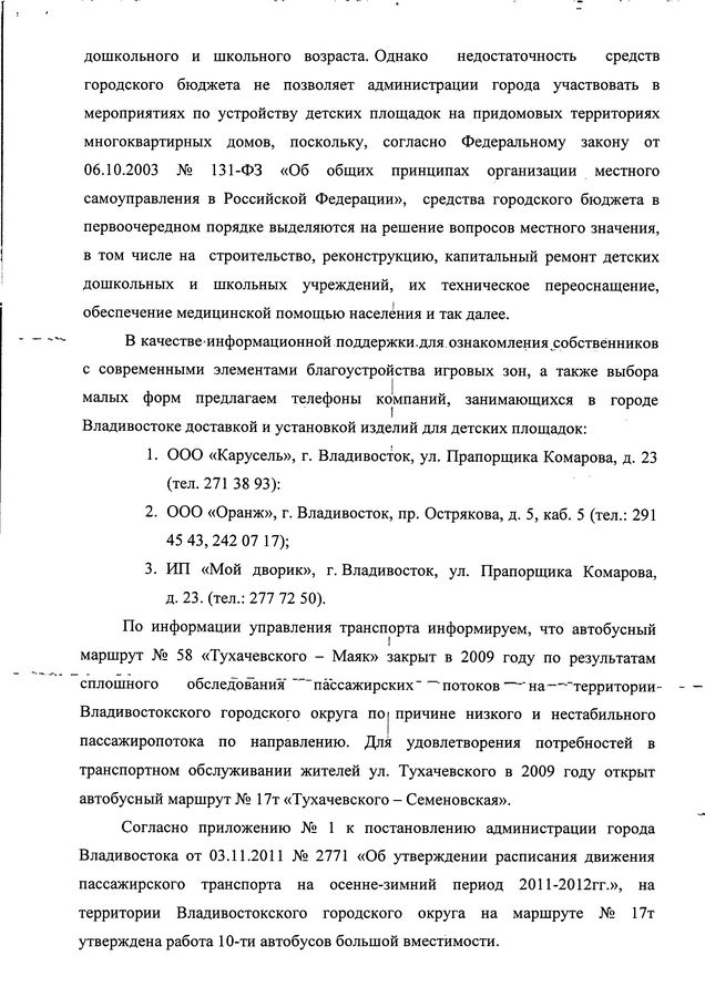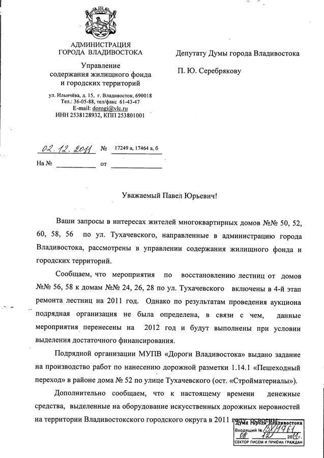 Благоустройство ул. Тухачевского продолжится в 2012 году![]() Благоустройство ул. Тухачевского продолжится в 2012 году. Это следует из ответа администрации Владивостока на запрос депутата Павла Серебрякова. В ходе придомовой встречи с жильцами домов на ул. Тухачевского Павлу Серебрякову поступили обращения жителей по поводу благоустройства района и придомовой территории. На их основе депутат сделал запрос в администрацию города с изложением замечаний и предложений граждан. В ответе, полученном депутатом, говорится, что мероприятия по восстановлению лестниц от домов ул. Тухачевского,56, 58 к домам на ул. Тухачевского, 24, 26, 28 были включены в четвертый этап ремонта лестниц на 2011 год. Однако по результатам аукциона подрядная организация не была определена, в связи с чем, данные мероприятия перенесены на 2012 год и будут выполнены при условии выделения достаточного финансирования. Также жителей БАМа беспокоил вопрос отсутствия разметки на месте пешеходного перехода, что делает переход небезопасным. По этому поводу был дан ответ, что подрядной организации МУПВ «Дороги Владивостока» выдано задание на производство работ по нанесению дорожной разметки пешеходного перехода в районе остановки «Стройматериалы» на ул. Тухачевского,52. Предложение по установке искусственных дорожных неровностей в районе дома на ул. Тухачевского,56 будет рассмотрено с учётом анализа аварийности, проводимого ОГИБДД УМВД России по городу Владивостоку. Также из ответа следует, что ремонт проезда, дорожек, хозяйственных и детских площадок, системы ливневой канализации, находящихся на территории земельного участка, являющегося общим имуществом многоквартирного дома, финансируются за счёт платежей населения на содержание и ремонт общего имущества в таком доме. И сами ремонтные работы должны осуществляться ТСЖ «Тухачевского,58». Потому что собственники домов ул. Тухачевского,56, 58 выбрали способ управления домом ТСЖ «Тухачевского,58». А принятие решения о ремонте общего имущества, благоустройстве придомовой территории, в том числе устройстве детской площадки, относится к компетенции общего собрания собственников помещений. Безусловно, в обязанности местного самоуправления входит создание условий для физического развития, досуга и отдыха детей дошкольного и школьного возраста, однако недостаточность средств городского бюджета не позволяет администрации города участвовать в мероприятиях по устройству детских площадок на придомовых территориях детских домов, поскольку в первую очередь средства выделяются на ремонт и восстановление детских учреждений, их техническое переоснащение и т.д. По поводу автобусного маршрута №58 «Тухачевского- Маяк» был дан ответ, что он был закрыт в 2009 году по причине низкого пассажиропотока. Для удовлетворения потребностей жителей БАМа был открыт маршрут №17т «Тухачевского-Семеновская». На осенне-зимний период администраций города была утверждена работа 10 автобусов большой вместимостью.