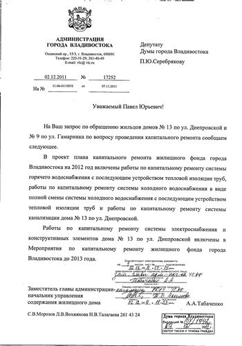 В ответе на запрос говорится, что в проект плана капитального ремонта жилищного фонда Владивостока на 2012 год включены работы по указанному адресу по капитальному ремонту системы горячего водоснабжения с последующим устройством тепловой изоляции труб, работы по капитальному ремонту системы холодного водоснабжения в виде полной смены системы холодного водоснабжения с последующим устройством тепловой изоляции труб и работы по капитальному ремонту системы канализации.