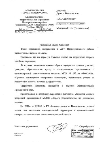 В официальном ответе говорится, что территория кладбища находится в ведении администрации Приморского края. Граждане, сбрасывающие мусор на данной территории привлекаются к административной ответственности.