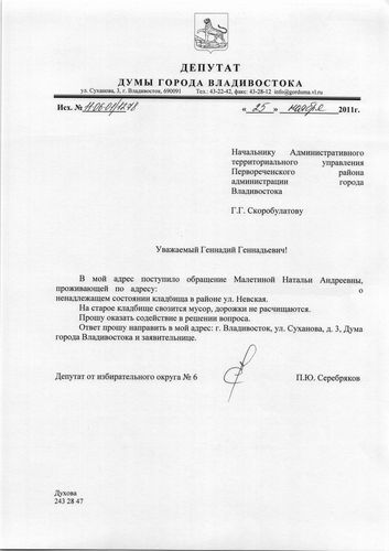 В адрес Павла Серебрякова поступило обращение жительницы района о ненадлежащем состоянии кладбища в районе ул. Невская. Дело в том, что туда постоянно свозится мусор, дорожки не расчищаются. По данному сигналу депутат направил письмо в администрацию Первореченского района.