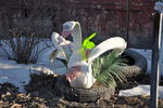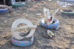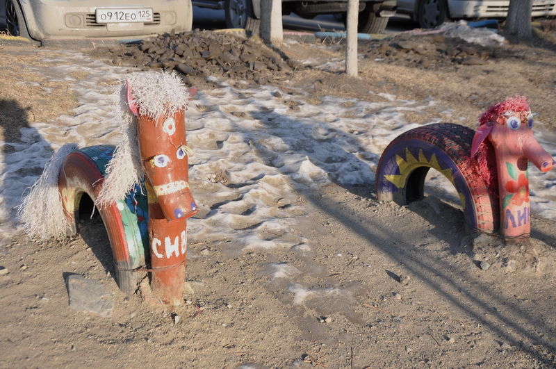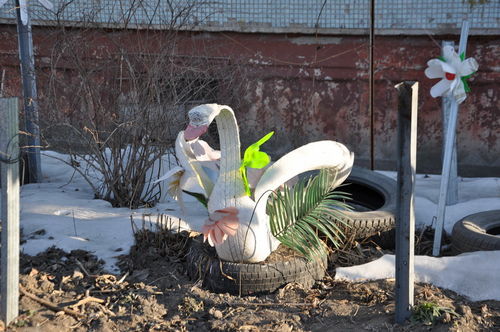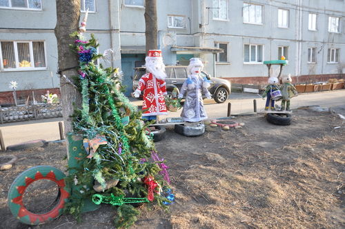 В итоге во дворе дома появились Дед Мороз, Снегурочка, заяц с волком, медвежонок с зайцом, лебеди, лошади. Все сделано из подручных материалов. Лебеди, лошади и медведь сооружены из автомобильных покрышек, частей деревьев и верёвок.