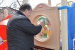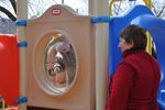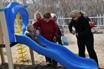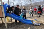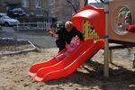 Взрослые также не прочь были поиграть на обновленной детской площадке и с удовольствием ловили своих детей на спуске горки.