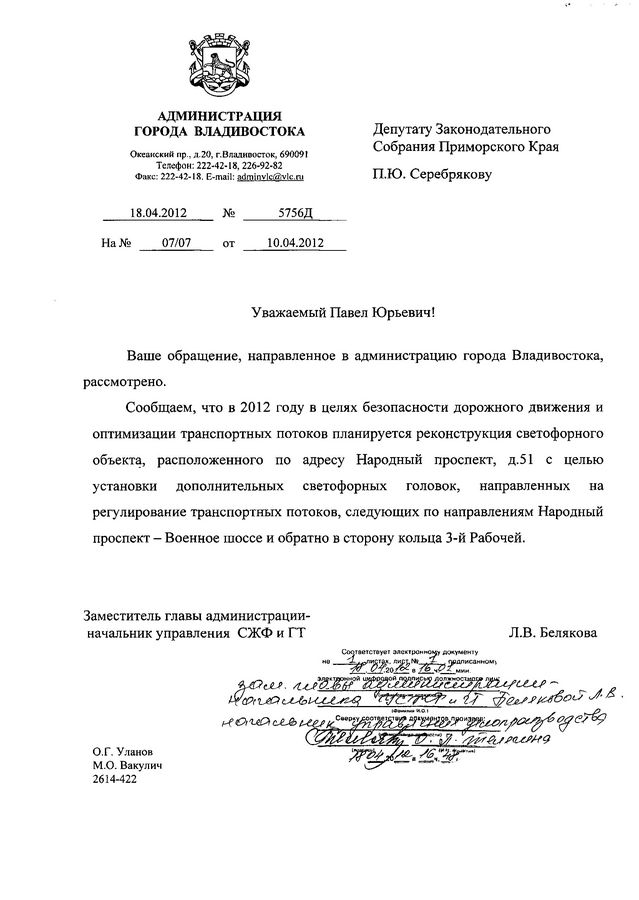 Администрация Владивостока прорабатывает схему движения на перекрестке Военного шоссе и Народного проспекта Администрация Владивостока прорабатывает схему движения на перекрестке Военного шоссе и Народного проспекта. Об этом говорится в ответе на обращение депутата Законодательного Собрания Павла Серебрякова.