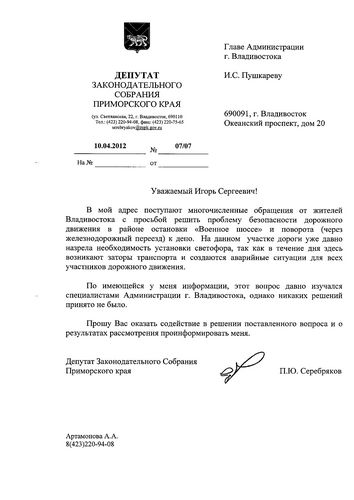 В адрес Павла Серебрякова неоднократно обращались автомобилисты с просьбой обратить внимание городских властей на ситуацию с дорожным движением в районе перекрестка улицы Военное шоссе и Народного проспекта. В настоящее время там наблюдаются частые заторы движения, которые создают аварийные ситуации.