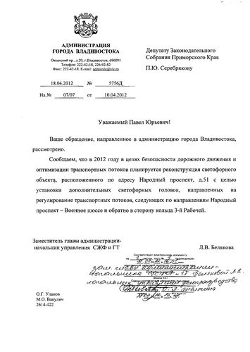 Согласно ответу администрации города на обращение депутата, в 2012 году в целях безопасности дорожного движения и оптимизации транспортных потоков планируется модернизация светофорного объекта, расположенного по адресу Народный проспект,51 (в непосредственной близости от вышеупомянутого перекрестка. - Прим. редакции) с целью установки дополнительных светофорных головок, направленных на регулирование транспортных потоков, следующих по направлениям Народный проспект – Военное шоссе и обратно в сторону кольца 3-ей Рабочей.