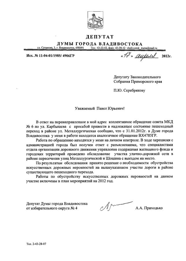 В ответ на депутатское обращение администрация Владивостока в лице специалистов отдела организации дорожного движения управления содержания жилищного фонда и городских территорий сообщило, что проведено обследование данного участка улично-дорожной сети в районе пересечения улиц Металлургической и Шошина с выездом на место. По результатам обследования принято решение об обустройстве искусственных дорожных неровностей на вышеуказанном участке дороги в районе существующего пешеходного перехода.