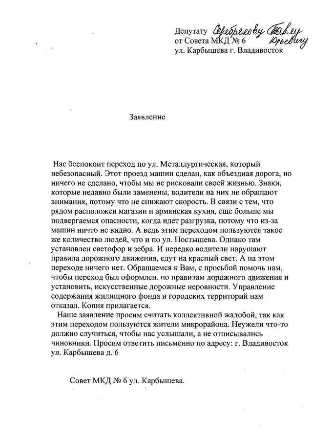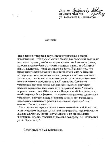 В адрес Павла Серебрякова поступило обращение от жителей ул. Карбышева,6 с просьбой оборудовать пешеходный переход согласно правилам дорожного движения, а также помочь установить светофор или пешеходную зебру на участок перехода проезжей части дороги. Аналогичные обращения поступали и в адрес депутата Думы города от жителей данных улиц Александра Приходько.