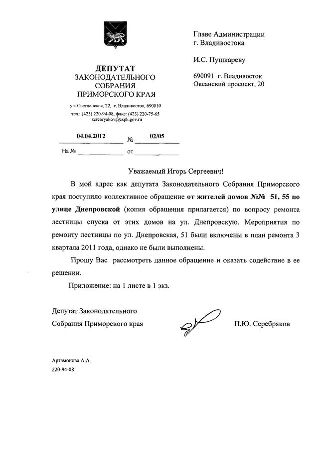 Согласно ответу администрации Владивостока, мероприятия по восстановлению лестничных маршей по ул. Днепровская,51 включены в проекта плана ремонта на 2012 год.