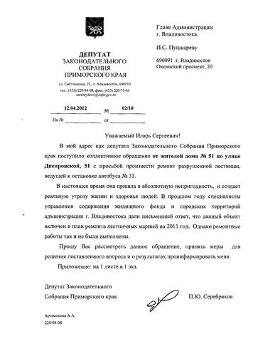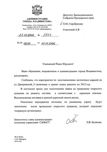 Согласно ответу администрации Владивостока, мероприятия по восстановлению лестничных маршей по ул. Днепровской,51 включены в проект плана ремонта на 2012 год. В настоящее время уже подготовлена заявка на проведение открытого аукциона по ремонту лестниц в соответствии с адресным списком. Ремонтные мероприятия лестницы по данному адресу будут выполнены поле определения подрядной организации.