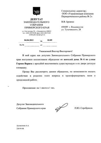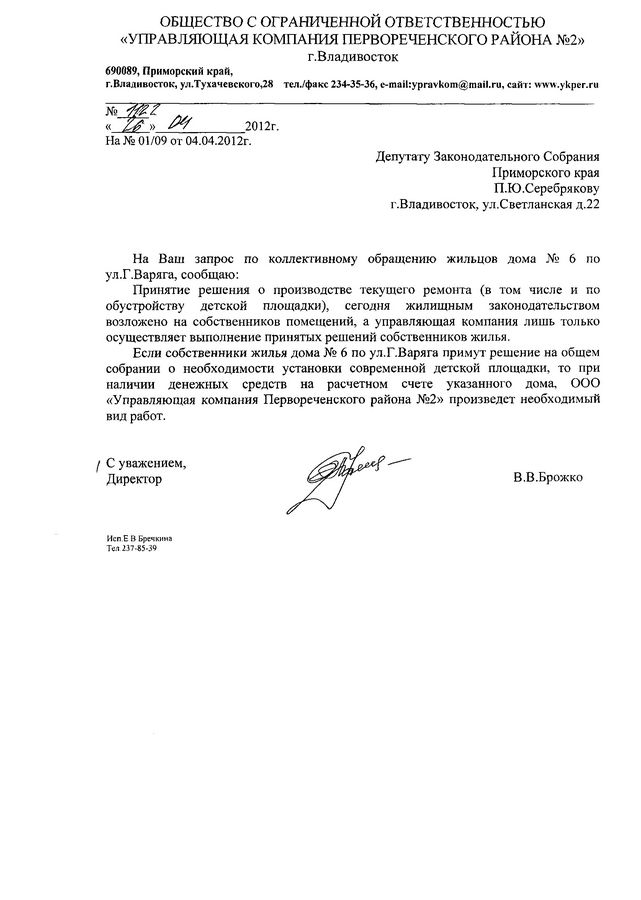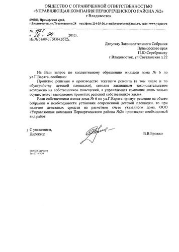 Как ответила «Управляющая компания Первореченского района №2», принятие решение о производстве текущего ремонта, в том числе и по обустройству детской площадки, сегодня жилищным законодательством возложено на собственников помещений, а управляющая компания только осуществляет выполнение принятых решений собственников жилья. Если собственники жилья дома №6 по ул. Героев Варяга примут решение на общем собрании о необходимости установки современной детской площадки, то при наличии денежных средств на расчетном счете указанного дома, «Управляющая компания Первореченского района №2» произведет необходимый вид работ.