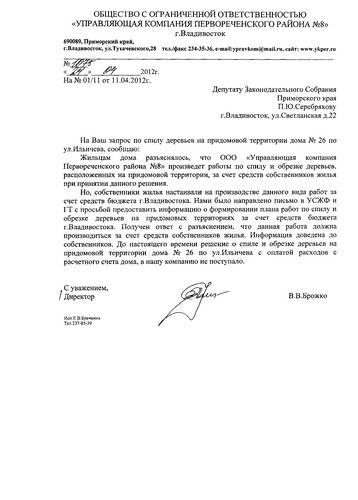 Данные работы невозможно произвести за счет бюджета города, такой ответ был получен управляющей компанией на запрос в УСЖФ с просьбой предоставить информацию о формировании плана работ по спилу и обрезке деревьев на придомовых территориях за счет средств бюджета Владивостока. Эта информация была доведена до пользователя, но пока решение о спиле деревьев на придомовой территории дома №26 по ул. Ильичева с оплатой расходов с расчетного счета дома не поступало.