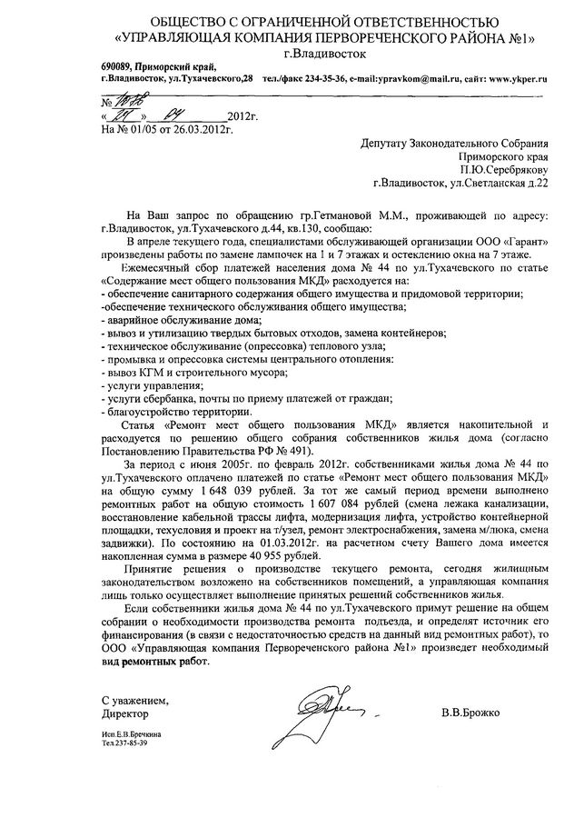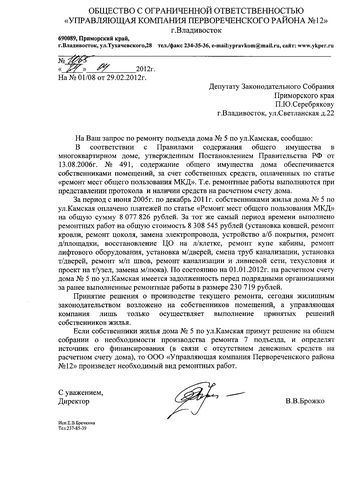 Согласно ответу «Управляющей компании Первореченского района №8», статья «Ремонт мест общего пользования МКД», по которой производится ремонт в подъездах, является накопительной и расходуется по решению общего собрания собственников жилья дома. Если собственники жилья дома ул.Тухачевского,44 и ул. Камская,5 примут решение на общем собрании о необходимости производства ремонта подъезда и определит источник финансирования, поскольку у дома нет на счету достаточных средств, то «Управляющей компании Первореченского района №8» произведет необходимый вид ремонтных работ.