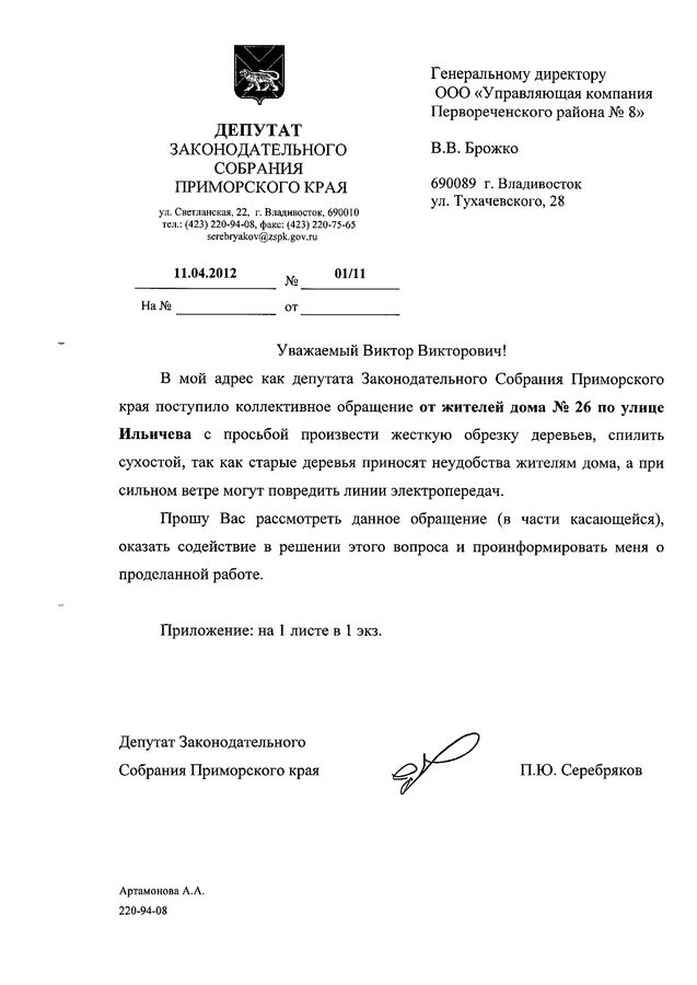 Так в адрес депутата поступило обращение от жителей ул. Ильичева,26 с просьбой помочь произвести жесткую обрезку деревьев, спилить сухостой, так как старые деревья приносят неудобства жителям дома, а при сильном ветре могут повредить линии электропередач.