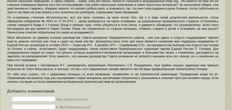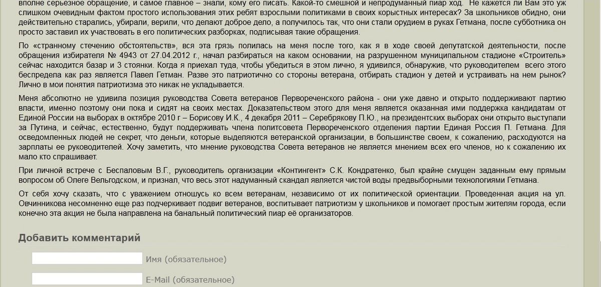 Депутат Владивостока обвинил первореченских ветеранов в "финансовых злоупотреблениях"![]() Депутат Думы Владивостока, член фракции КПРФ Олег Вельгодский обвинил ветеранов Первореченского района города в "финансовых злоупотреблениях". По мнению коммуниста, выделяемые участникам войны и труженикам тыла деньги идут на зарплаты руководителей, сами ветераны говорят, что работают бескорыстно, поскольку бюджетного финансирования не получают, сообщает корр. РИА PrimaMedia. На своем персональном сайте Олег Вельгодский, дискутируя по факту выдвинутых в его адрес обвинений в проявленном к ветеранам неуважении, выдвинул новые претензии к участникам Великой Отечественной войны: - Меня абсолютно не удивила позиция руководства Совета ветеранов Первореченского района - они уже давно и открыто поддерживают партию власти, именно поэтому они пока и сидят на своих местах. (…) Для осведомленных людей не секрет, что деньги, которые выделяются ветеранской организации, в большинстве своем, к сожалению, расходуются на зарплаты ее руководителей. Хочу заметить, что мнение руководства Совета ветеранов не является мнением всех его членов, но к сожалению их мало кто спрашивает". Принт-скрин страницы сайта Как сообщили корр. агентства в самом Совете ветеранов Первореченского района, обвинения, прозвучавшие от депутата, достаточно серьезные, если учесть, что ветеранов вряд ли можно назвать самой обеспеченной категорией граждан в нашей стране. И обычный гражданин вполне может на них "купиться". По мнению ветеранов, как депутат Думы Владивостока Олег Вельгодский должен достаточно хорошо знать городской бюджет. И для него вряд ли должно быть открытием, что Совет ветеранов Первореченского района – это общественная некоммерческая организация. Она не финансируется из городского или краевого бюджета, и ее члены работают на чистом энтузиазме. - Наш Совет ветеранов не финансируется государством. Все, кто у нас здесь работают - энтузиасты. Но мы - одна большая дружная семья: инвалиды войны, труженики тыла, вдовы участников войны, блокадники Ленинграда, узники концлагерей и ветераны военной службы, - говорит председатель Совета Ветеранов Первореченского района Иван Панасюк. - В активе нашего Совета собрались те, кому не безразличны судьбы людей, которых коснулась война. Эта работа абсолютно бескорыстная, но она дает мне силы, так же, как и моим коллегам. Потому что мы имеем возможность заниматься патриотическим воспитанием детей, поддержкой тех, кто уже не в силах самостоятельно передвигаться, и это отнюдь не коммерческая выгода. Те небольшие деньги, которые нам выделяют спонсоры, мы тратим на канцелярию, компьютерное обслуживание и уборщицу. И мне совершенно не понятно, о каких зарплатах говорит депутат Олег Вельгодский". Напомним, поводом для гневных слов в адрес ветеранов стало обвинение депутата Думы Владивостока от КПРФ Олега Вельгодского в неуважении к участникам боевых действий Весной этого года в Первореченском районе активисты организовали "Народный десант", в ходе которого начали благоустраивать сквер на ул. Овчинникова рядом с печально известным "домом на костях". В разгар работ на площадке появился в деловом костюме и начищенных туфлях депутат-коммунист Олег Вельгодский, который прилюдно обвинил командира "Народного десанта", участника боевых де