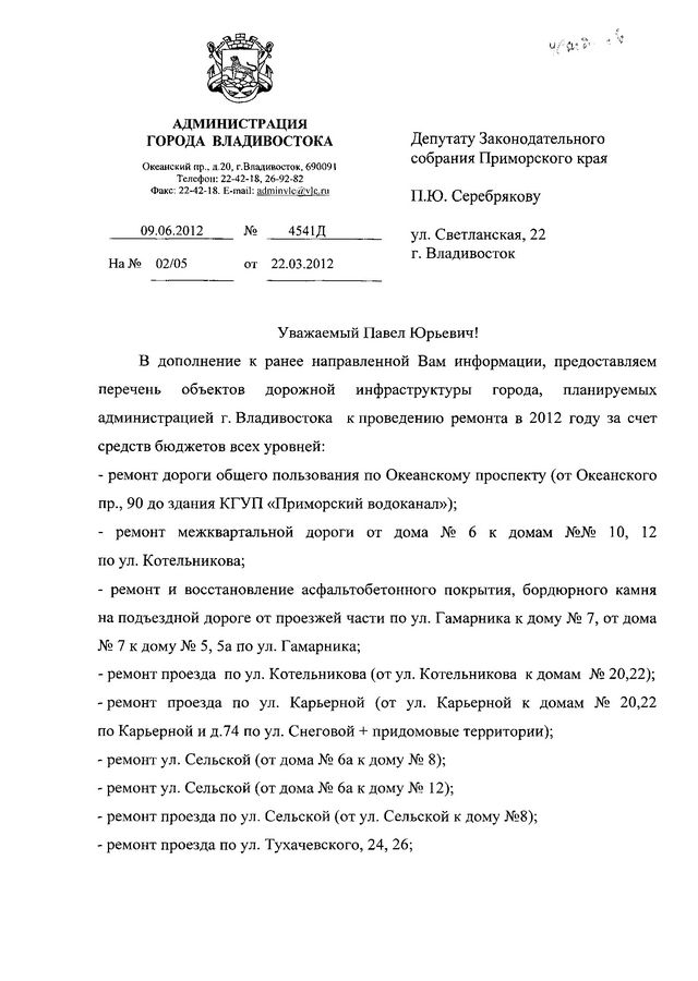 Определен итоговый список дорожной инфраструктуры Первореченского района, подлежащей ремонту в 2012 году![]() Определен итоговый список подъездных и придомовых дорог и подпорных стен Первореченского района, подлежащих ремонту в 2012 году. К уже существующему перечню на сайте 1речка добавилось еще два адреса на улицах Гамарника и Тухачевского. Согласно официальному ответу администрации Владивостока на запрос депутата Законодательного Собрания Приморского края Павла Серебрякова, в 2012 году на бюджетные средства планируется отремонтировать на два объекта больше, чем ранее указывалось на сайте 1 речка. К числу улиц, которые будут благоустроенны в этом году, добавились ул. Гамарника и Тухачевского. Ремонт и восстановление асфальтобетонного покрытия, бордюрного камня будет произведен на подъездной дороге от проезжей части по ул. Гамарника к дому №7, от дома №7 к домам №№5, 5а по ул. Гамарника. Также планируется отремонтировать подпорную стенки по адресу ул. Тухачевского,60. Как прокомментировал сайту 1Речка депутат Законодательного Собрания Приморского края Павел Серебряков, ремонт подъездной дороге от проезжей части по ул. Гамарника к дому №7, от дома №7 к домам №№5, 5а по ул. Гамарника, как и многие в списке на этот год, был запланирован еще в прошлом году, но по определенным причинам не был произведен. Поэтому он также был перенесен на текущий год. Второй же адрес – на ул. Тухачевского – давняя проблема, давно беспокоившая жителей. Состояние подпорной стены требовало незамедлительного вмешательства. «Дорога на ул. Гамарника, как и большинство дорог, заявленных в списке на ремонт в 2012 году – наболевшая. Она уже была в списках адресов на выполнение ремонта, и попала в конкурсную документацию прошлого года, но ремонт администрацией города произведен не был по ряду причин. В этом году мы столкнулись с проблемой, что по некоторым адресам дороги на столько изношены, что по ним почти невозможно нормально передвигаться, такой как раз является подъездная и придомовая дорога на Гамарника. Подобные дороги – предмет постоянных обращений граждан в мою приемную, поэтому они в первую очередь подаются мною в наказах избирателей. Так общими усилиями, нам удалось добиться перенесения адресов прошлого года в нынешний список. Надеюсь, что в этом году работы будут выполнены в полном объеме и качественно». Напомним, что следить за качеством выполнения работ и сообщать можно, обратившись в приемную депутата Павла Серебрякова, либо на форуме сайта 1речка.ру. Полный адресный список придомовых территории, подлежащих ремонту в Первореченском районе можно посмотреть здесь.