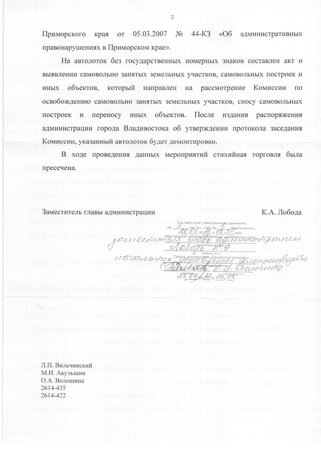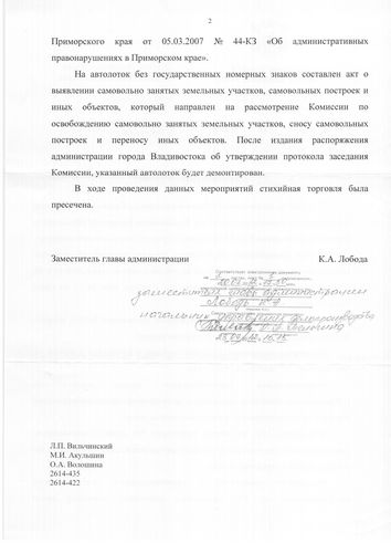 Нарушители привлечены к административной ответственности. На автолоток без номерных знаков составлен акт о выявлении самовольно занятых земельных участков, сносу самовольных построек и переносу иных объектов. После издания распоряжения администрации Владивостока об утверждении протокола заседания Комиссии, указанный автолоток будет демонтирован.