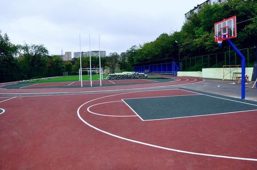 На стадионе уже появилось поле с искусственным прорезиненным покрытием, комплексы сооружений со спортивным городком, площадкой для прыжков в длину, беговыми дорожками, футбольным полем и трибунами. На баскетбольной площадке установили баскетбольные кольца, а в правом углу стадиона расположились раздевалки для учеников.