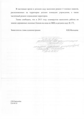 В настоящее время в саду №175 выполнен ремонт четырех теневых навесов, расположенных на территории детских площадок учреждения, а также частичный ремонт ограждения.