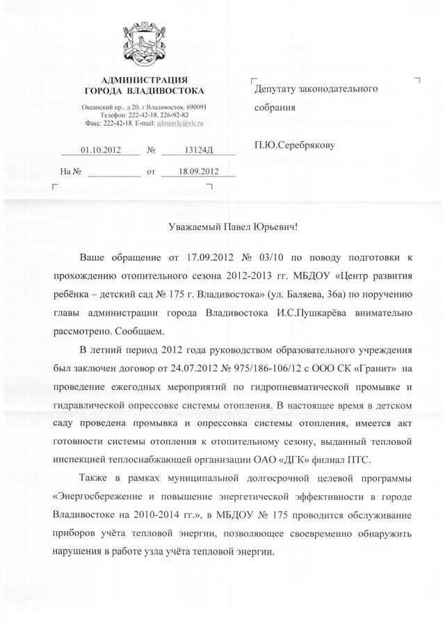 Пока в летний период 2012 года руководством образовательного учреждения был заключен договор с ООО СК «Гранит» на проведение ежегодных мероприятий по гидравлической промывке и опрессовке системы отопления. Эти процессы уже проведены, и имеется акт готовности системы отопления к отопительному сезону, выданный тепловой инспекцией теплоснабжающей организации ОАО «ДГК» филиал ПТС.