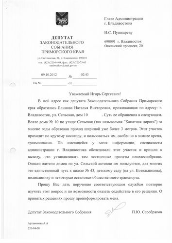 В приемную Павла Серебрякова обратились жители улицы Сельской с просьбой установить лестницу на месте «канатной дороги» к улице Стрелочной. По словам жителей, это единственный путь к таким социально значимым объектам, как школа №43, детский сад, поликлинику, остановку, почту и рынок. И люди ежедневно, рискуя своим здоровьем, ходят по этой тропе. Зимой она становится обледенелая, и людям приходится ходить в обход, что занимает на 30 минут больше.