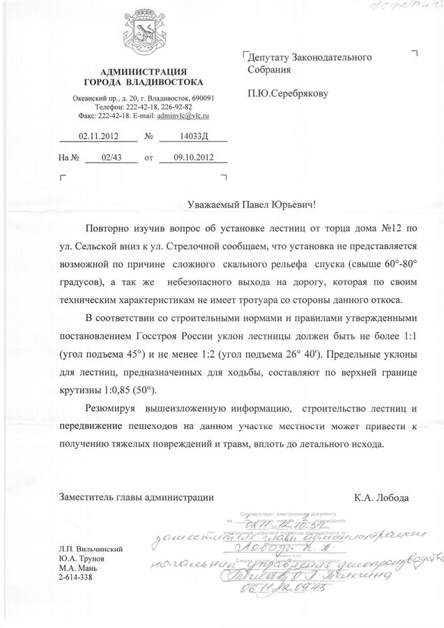 Установить лестницу на спуске с улицы Сельской к Стрелочной не позволяют нормы Госстроя России Установить лестницу на спуске с улицы Сельской к Стрелочной не позволяют нормы Госстроя России. Такой ответ дала администрация Владивостока на запрос депутата Законодательного Собрания Приморского края Павла Серебрякова.