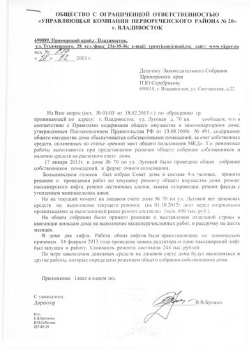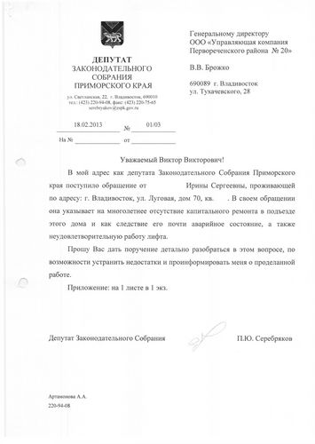 В приемную депутата Законодательного Собрания Приморского края Павла Серебрякова обратилась жительница дома №70 по улице Луговой с просьбой прояснить ситуацию с многолетним отсутствием капитального ремонта дома и, как следствия, его почти аварийного состояния. Депутатом было сделано обращение в Управляющую компанию Первореченского района, обслуживающую данный дом.