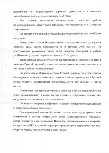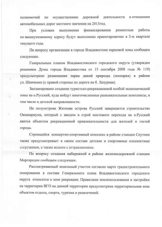 Парковая зона в районе станции «Моргородок» появится в Первореченском районе Обустройство набережной и прилегающей к ней территории в районе железнодорожной станции «Моргородок» возможно и целесообразно, согласно утвержденной градостроительной документации. А зона отдыха «Моргородок» от Нефтебазы до школы ДОСААФ запланирована к реализации уже в 2013-2014 годах. Об этом говорится в ответе администрации Владивостока на запрос депутата Законодательного Собрания Приморского края Павла Серебрякова.