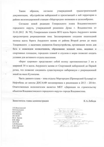 Таким образом, согласно утвержденной градостроительной документации, обустройство набережной и прилегающей к ней территории в районе железнодорожной станции «Моргородок» возможно и целесообразно.