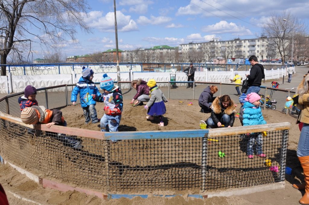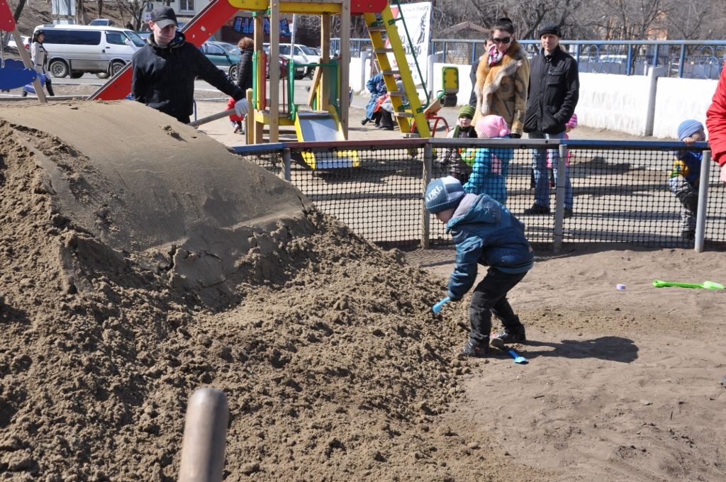 Больше всех довольны были дети, и пока курсанты и студенты раскидывали песок, они пытались сделать тоже самое, но своими маленькими лопатками, чтобы поскорее начать играть.
