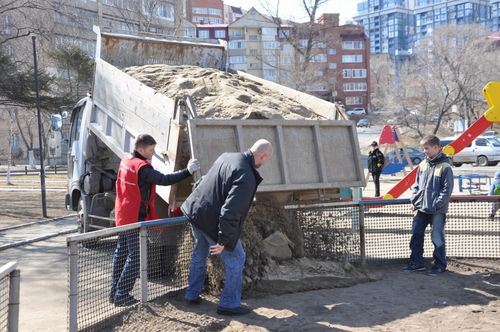 Центральным же местом для уборки снова стал сквер ветеранов. Здесь курсанты Дальрыбвтуза и студены Владивостокского Гуманитарно-Коммерческого колледжа навели чистоту и побелили бардюры. А поскольку главное место в сквере занимает песочница, которую соорудили в ходе субботника в 2011 году, в нее подвезли песка.