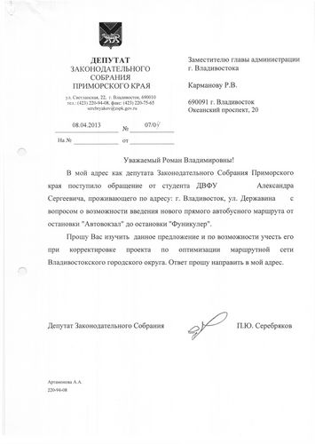 В общественную приемную депутата Павла Серебрякова обратился студент ДВФУ с вопросом о введении прямого автобусного маршрута от остановки «Автовокзал» до остановки «Фуникулер».