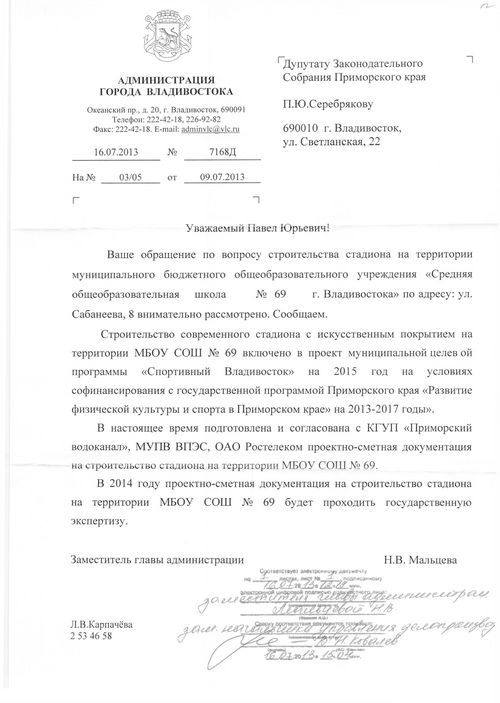 Как ответили специалисты администрации Владивостока, строительство современного стадиона с искусственным покрытием на территории МБОУ СОШ №69 включено в проект муниципальной целевой программы «Спортивный Владивосток» на 2015 год на условиях софинансирования с государственной программой Приморского края «Развитие физической культуры и спорта в Приморском крае на 2013-2015 годы».