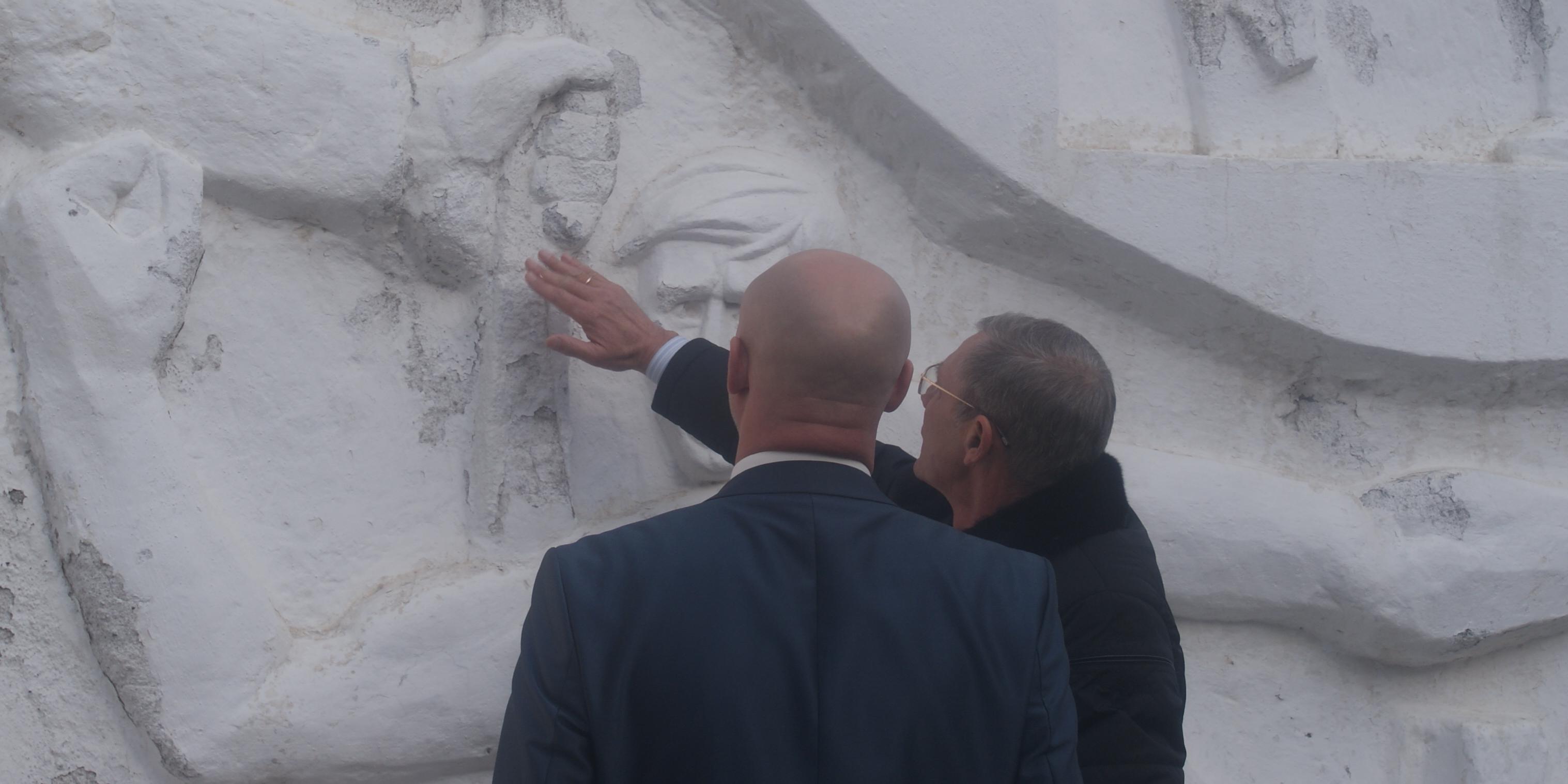 Юрий Корсаков внимательно изучил состояние памятника. Несмотря на то, что мемориал героям стоит в оживленном месте – между домами №4а и №6 по улице Вострецова – и постоянно находится на виду местных жителей, памятник требует реставрационных работ.