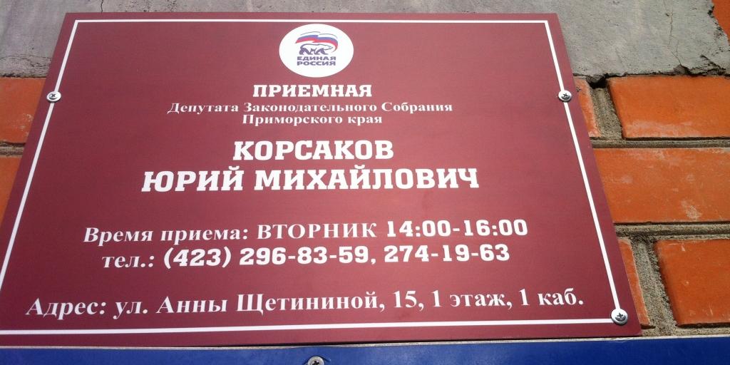 Общественная приемная Юрия Корсакова откроется в Снеговой Пади Общественная приемная депутата Законодательного собрания Приморского края Юрия Корсакова начнет работу в микрорайоне Снеговая Падь. Депутатская приемная будет открыта по адресу: ул. Анны Щетининой, 15, для удобства жителей микрорайона, от которых поступает значительное количество жалоб и обращений.